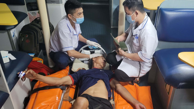 Bằng tốc độ hành trình nhanh nhất, lúc 1 giờ 15 phút ngày 31/10, lực lượng cứu nạn hàng hải đã tiếp cận được tàu QNg 98308 TS, đội ngũ y, bác sỹ cùng nhân viên viên cứu nạn lập tức lên tàu QNg 98308 TS để thực hiện cấp cứu tại chỗ. Tình trạng bệnh nhân lúc này đã mất ý thức, liệt nửa người và lập tức được các y bác sỹ chuyên khoa thực hiện cấp cứu để ổn định tình trạng và chuyển lên tàu SAR 412 để được chăm sóc y tế chuyên khoa và khẩn trương đưa về đất liền điều trị.