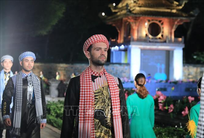 Màn trình diễn áo dài tại Văn Miếu - Quốc Tử Giám tạo nên một vẻ đẹp lung linh, huyền ảo cho chiếc áo dài Việt Nam. Ảnh: Thành Đạt - TTXVN