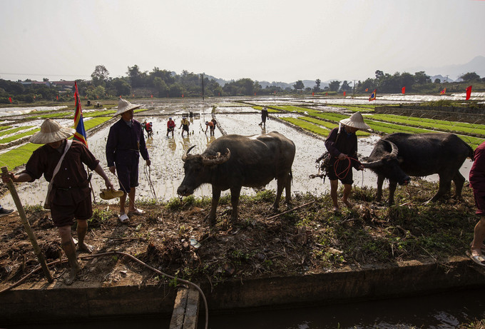Bà con người dân tộc Mường thực hiện nghi lễ xuống đồng để mở đầu cho một năm mới làm ăn phát đạt, mùa màng bội thu. Ảnh: Trọng Đạt - TTXVN