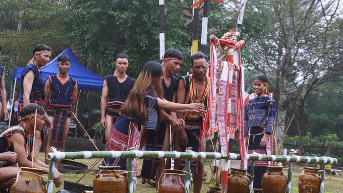 Trong không khí trang nghiêm, trước sự chứng kiến của dân làng và gia đình 2 họ, người đại diện sẽ làm lễ khấn báo với thần bản mệnh của cộng đồng.