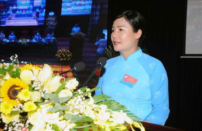 Chủ tịch Hội Liên hiệp Phụ nữ tỉnh Sơn La khóa XIII, nhiệm kỳ 2021-2026, Bùi Thanh Thủy phát biểu bế mạc Đại hội. Ảnh: Quang Quyết-TTXVN