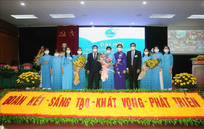 Lãnh đạo Tỉnh ủy Sơn La tặng hoa chúc mừng Ban Chấp hành Hội Liên hiệp Phụ nữ tỉnh Sơn La khóa XIII, nhiệm kỳ 2021-2026 Ảnh: Quang Quyết-TTXVN
