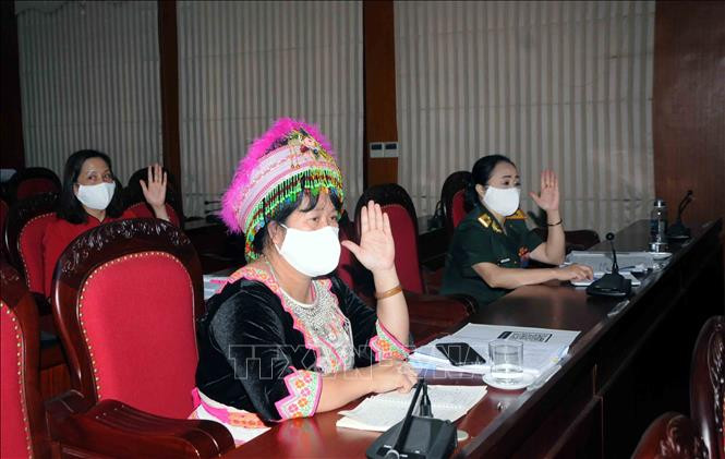 Các đại biểu biểu quyết bầu ra Ban Chấp hành Hội Liên hiệp Phụ nữ tỉnh Sơn La khóa XIII, nhiệm kỳ 2021-2026, gồm 35 người. Ảnh: Quang Quyết-TTXVN