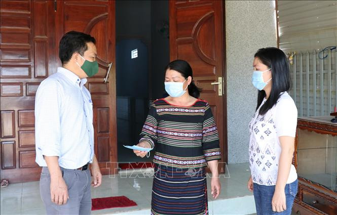 Bà A Hà (49 tuổi, người dân tộc Bahnar), Trưởng thôn kiêm Bí thư chi bộ thôn Ama Hlil 2, xã Ia Mrơn, huyện Ia Pa (Gia Lai) tuyên truyền, vận động người dân chấp hành nghiêm các quy định phòng, chống dịch COVID-19. Ảnh: Hồng Điệp - TTXVN