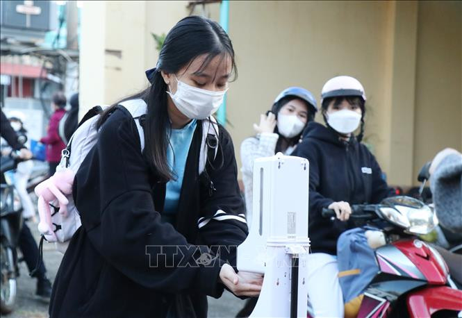 Học sinh trường Trung học phổ thông Buôn Ma Thuột đo thân nhiệt, sát khuẩn tay trước khi vào lớp học. Ảnh: Tuấn Anh – TTXVN