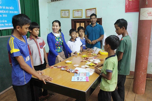 Lãnh đạo Phòng Văn hóa - Thông tin huyện Cư Kuin (Đắk Lắk) thăm hỏi và động viên các nghệ nhân "nhí" chăm học đánh chiêng ở buôn Hra Ea Hing