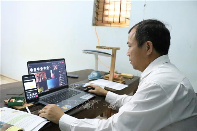 Một tiết dạy trực tuyến của giáo viên trường Trung học cơ sở Nguyễn Tri Phương, xã Quảng Tiến, huyện Cư M’gar (Đắk Lắk). Ảnh: Tuấn Anh – TTXVN