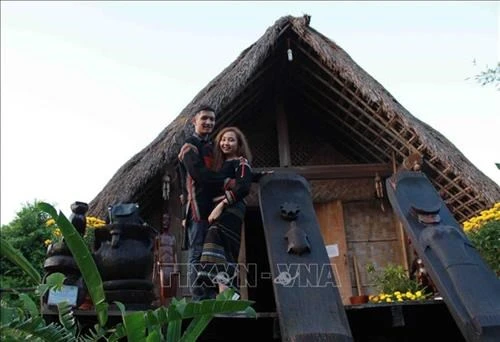 Đôi bạn trẻ trong trang phục truyền thống của người Ê Đê chụp ảnh lưu niệm ở ngôi nhà dài trong Khu du lịch cộng đồng Ko Tam. Ảnh: Phạm Cường-TTXVN