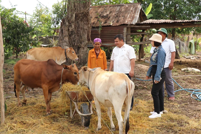 Cán bộ Huyện ủy Krông Bông thăm, động viên gia đình khó khăn được hỗ trợ xây nhà tình nghĩa từ nguồn Quỹ tiết kiệm làm theo lời Bác tại buôn Đắk Tua, xã Cư Pui Ảnh: Anh Dũng - TTXVN