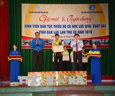 | Tuyên dương sinh viên dân tộc thiểu số tỉnh Đắk Lắk có thành tích học tập tốt lần thứ XX năm 2018. Ảnh: Hoài Thu – TTXVN |