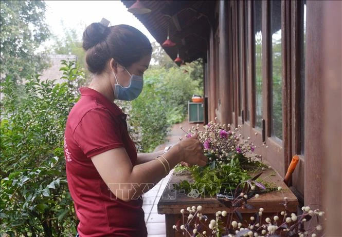 Nhân viên một khu du lịch tại thành phố Buôn Ma Thuột cắm hoa, trang trí, sẵn sàng mở cửa và phục vụ du khách. Ảnh: Hoài Thu – TTXVN