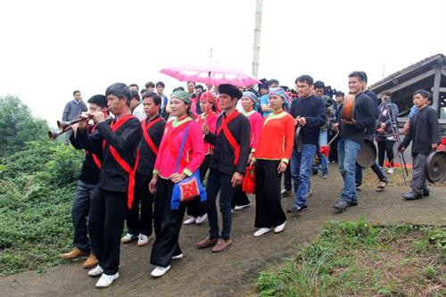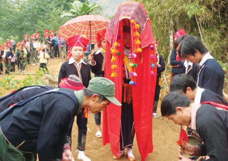 Thủ tục xin dâu xong, cô dâu bước từ buồng ra cùng chú rể đến trước bàn thờ cúi lạy tổ tiên, xong việc người chị gái cõng cô dâu ra khỏi cửa trao cho nhà trai, nhà trai cử một phụ nữ khỏe mạnh đón và cõng cô dâu đi. Nếu gần, cõng đến tận nhà, ở xa phải đi ngựa. Về đến nhà trai, sau thủ tục chờ giờ bước qua cửa chính, cô dâu và chú rể đến trước bàn thờ gia tiên cúi lạy, sau đó hai vợ chồng vào buồng bỏ khăn che mặt, tháo băng đỏ. Bữa tiệc nhà trai diễn ra tương tự như nhà gái, họ cũng dùng câu hát để cảm ơn và nhắc nhở dặn dò con dâu, con rể sống bên nhau trọn đời hạnh phúc.