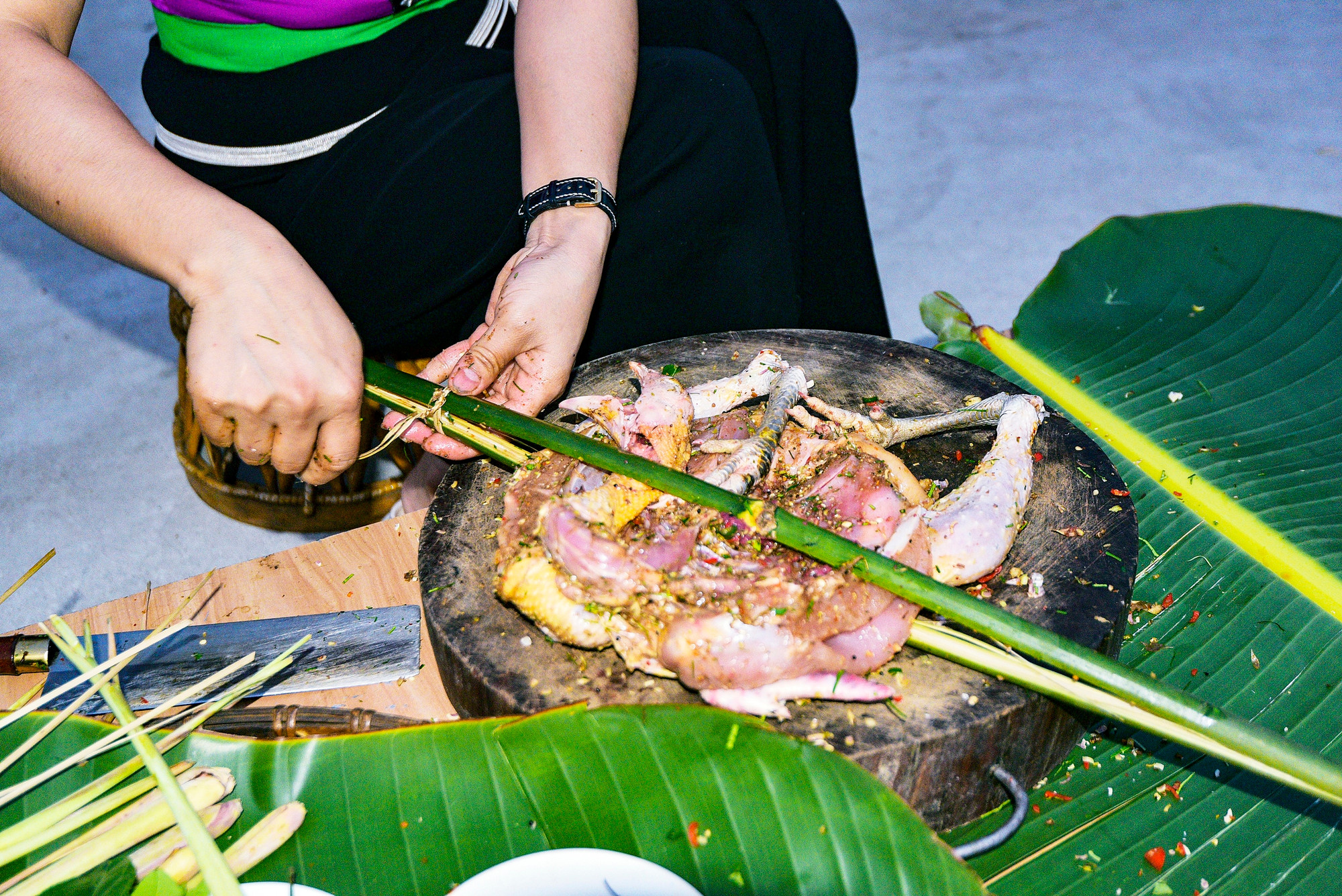 Trước khi ướp, gà sẽ được khía phần lưng và cánh để gia vị thấm đều ngon hơn. Sau đó, tất cả các gia vị sẽ được trộn đều với nhau và xoa đều lên gà và để 15 - 20 phút để gà ngấm gia vị.