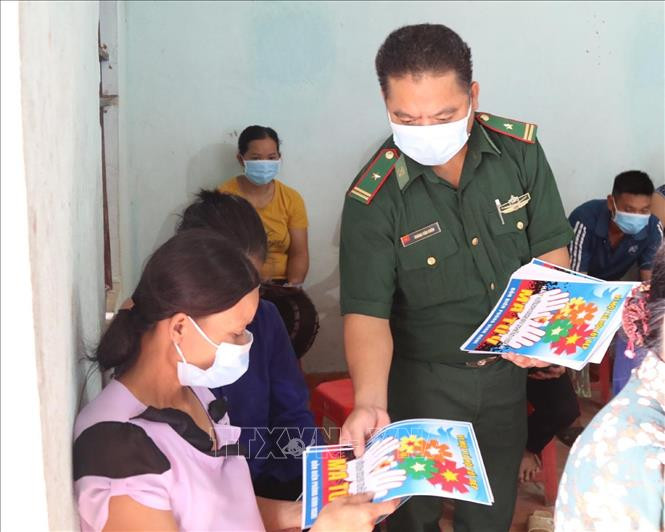 Cán bộ Đồn Biên phòng Bình Nghi (Lạng Sơn) phát tờ rơi tuyên truyền pháp luật cho người dân vùng biên giới. Ảnh: Quang Duy – TTXVN