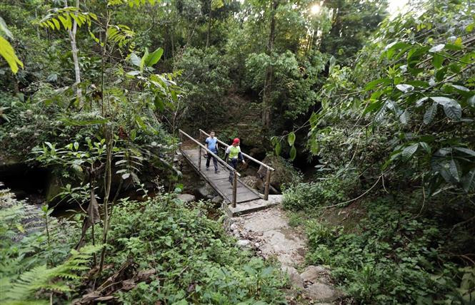 Du khách khám phá, hòa mình vào khung cảnh thiên nhiên hùng vĩ của núi rừng Tây Bắc. Ảnh: Quý Trung - TTXVN