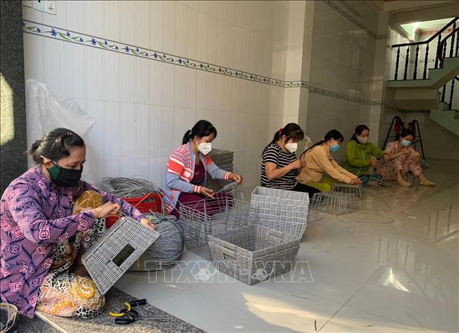 Phụ nữ xã Lương Quới, huyện Giồng Trôm được đào tạo nghề đan giỏ nhựa để nâng cao thu nhập. Ảnh: Chương Đài - TTXVN