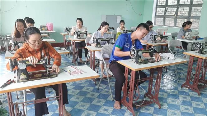 Các học viên tham gia khóa học may tại Trung tâm Giáo dục Nghề nghiệp - Giáo dục Thường xuyên huyện Kbang. Ảnh: Hoài Nam - TTXVN