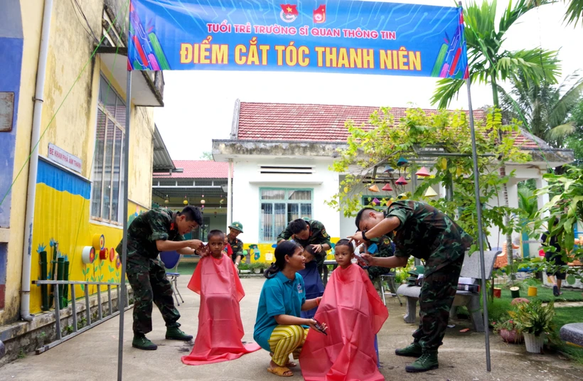 Các thanh niên Trường Sĩ quan Thông tin (Khánh Hòa) cắt tóc miễn phí cho trẻ em xã Ninh Tây, thị xã Ninh Hòa, tỉnh Khánh Hòa. Ảnh: TTXVN phát