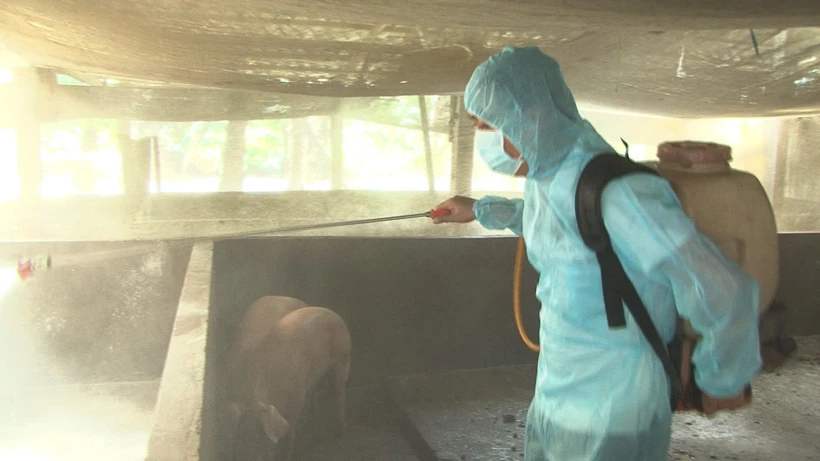 Lực lượng chức năng tiến hành phun khử khuẩn khu vực chuồng trại bị nhiễm dịch bệnh. Ảnh: Chanh Đa-TTXVN