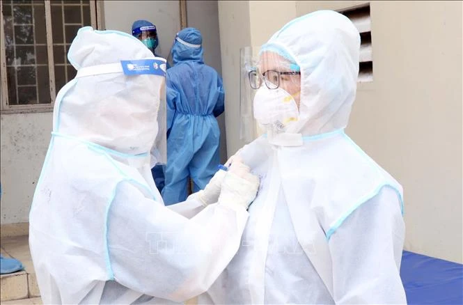 Điều dưỡng tại Bệnh viện dã chiến thu dung, điều trị COVID-19 số 4 (xã Vĩnh Lộc B, huyện Bình Chánh) nhờ đồng nghiệp ghi tên lên áo để chuẩn bị tiếp nhận bệnh nhân. Ảnh: Xuân Khu-TTXVN