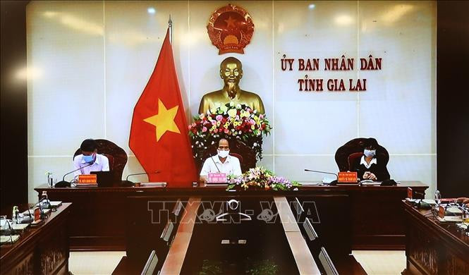 Điểm cầu họp trực tuyến Ủy ban nhân dân tỉnh Gia Lai. Ảnh: Văn Điệp – TTXVN