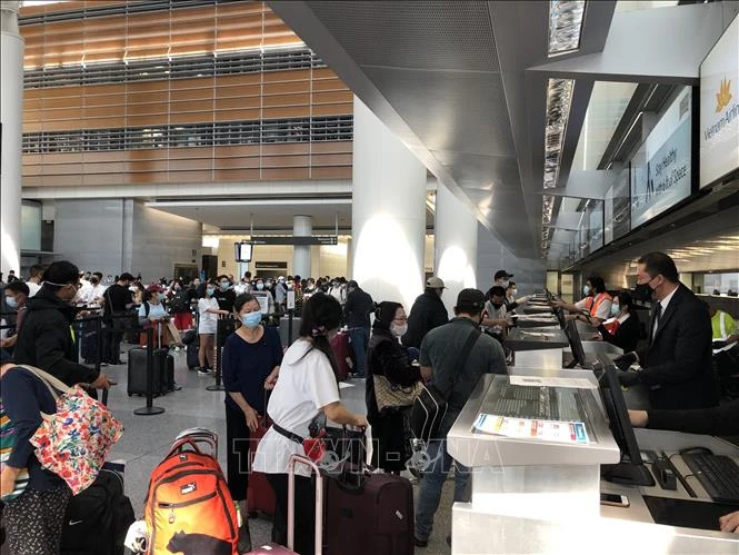 Các công dân chờ làm thủ tục lên máy bay về nước. Ảnh: TTXVN/phát