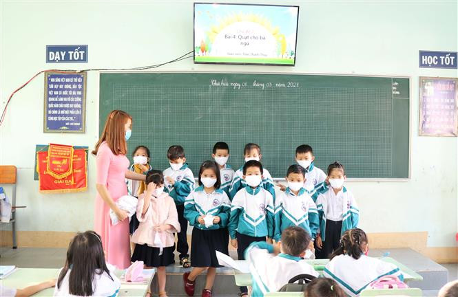 Giáo viên trường Tiểu học Nguyễn Lương Bằng hướng dẫn học sinh cách đeo khẩu trang, rửa tay khử khuẩn. Ảnh: Hồng Điệp - TTXVN