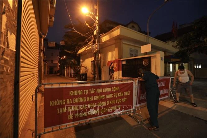 Lực lượng chức năng lập chốt phong toả ngõ 55 Gia Thượng (Ngọc Thụy, Long Biên). Ảnh: Minh Quyết - TTXVN