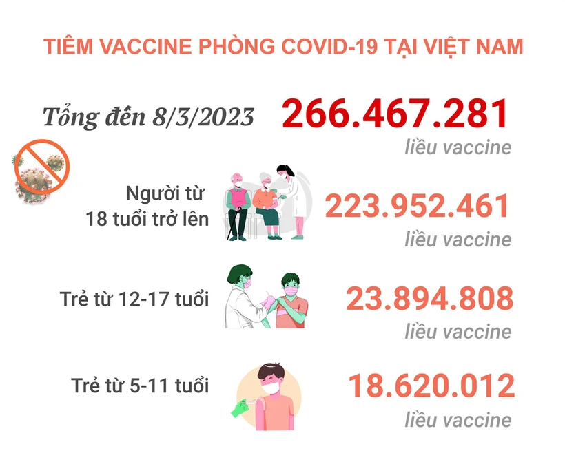Trong ngày 8/3 có 15.899 liều vaccine phòng COVID-19 được tiêm. Như vậy, tổng số liều vaccine đã được tiêm là 266.467.281 liều. Trong đó, số liều tiêm cho người từ 18 tuổi trở lên là 223.952.461 liều: Mũi 1 là 71.083.379 liều; mũi 2 là 68.708.800 liều; mũi bổ sung là 14.534.368 liều; mũi nhắc lại lần 1 là 51.987.757 liều; mũi nhắc lại lần 2 là 17.638.157 liều.