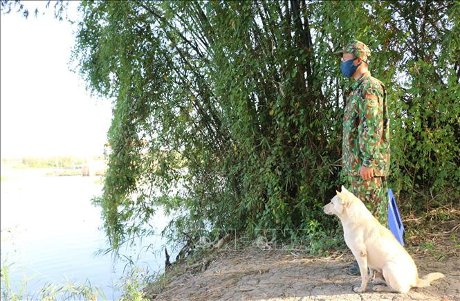 Chiến sỹ tổ công tác phòng, chống dịch COVID-19 số 1, thuộc Đồn biên phòng Cửa khẩu quốc tế Dinh Bà (huyện Tân Hồng,Đồng Tháp) túc trực 24/24 trên bờ sông Sở Hạ. Ảnh: Chương Đài - TTXVN