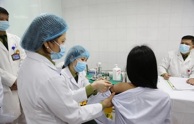 Tiêm mũi vắcxin đầu tiên ngừa COVID-19 Nano Covax nhóm liều 50mcg cho tình nguyện viên nữ. Ảnh: Diệp Trương-TTXVN