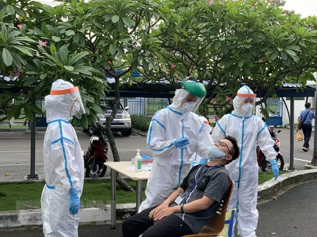 Các y bác sỹ Trung tâm kiểm soát bệnh tật Thành phố Hồ Chí Minh và Quận 7 thực hiện xét nghiệm sàng lọc COVID-19 ngẫu nhiên cho công nhân. Ảnh: Thanh Vũ/TTXVN