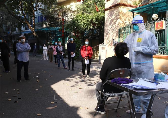 Người dân trong khu vực bị phong tỏa phố Đỗ Hành được lấy mẫu xét nghiệm sàng lọc COVID-19 sáng 4/12. Ảnh: Hoàng Hiếu - TTXVN