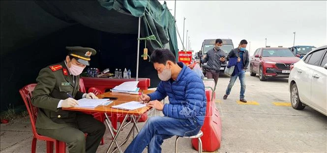 Lực lượng chức năng làm nhiệm vụ hướng dẫn, phân luồng giao thông, khai báo y tế tại chốt trạm cầu Bạch Đằng, thị xã Quảng Yên, tỉnh Quảng Ninh. Ảnh: TTXVN