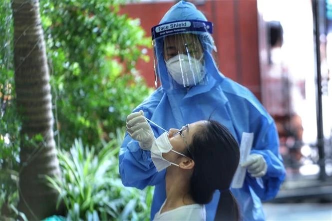 Lấy mẫu xét nghiệm COVID-19 cho cư dân phường Khâm Thiên, quận Đống Đa, Hà Nội . Ảnh: Tuấn Đức - TTXVN