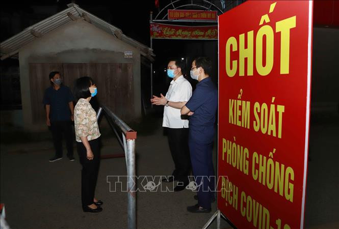 Lãnh đạo UBND huyện Bình Xuyên kiểm tra các chốt kiểm soát tại thôn Tiền Phong, xã Tân Phong huyện Bình Xuyên, Vĩnh Phúc. Ảnh: Hoàng Hùng - TTXVN