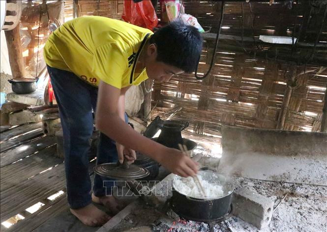Cháu Quàng Trung Thành (người dân tộc Khơ Mú, ở bản Pa Xa Xá, xã Pa Thơm, huyện Điện Biên, tỉnh Điện Biên) phụ giúp gia đình những công việc hàng ngày. Ảnh: Xuân Tiến- TTXVN