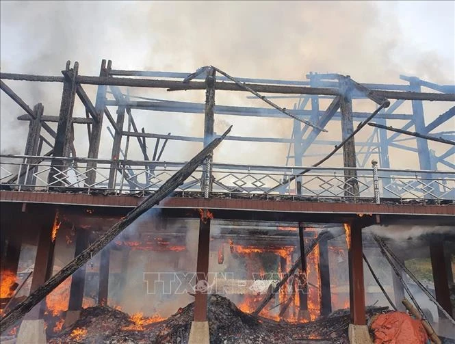 Toàn bộ ngôi nhà bị thiêu rụi, chỉ còn trơ lại bộ khung với hệ thống cột, kèo, xà… Ảnh: TTXVN phát