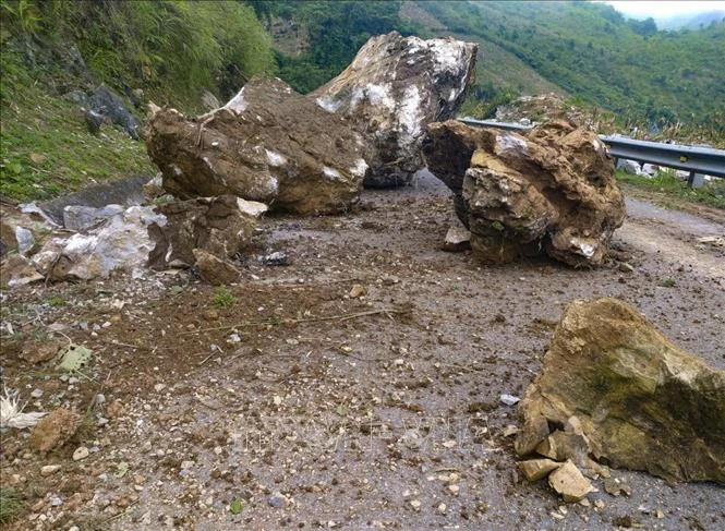 Những tảng đá kích thước lớn lăn từ sườn núi xuống mặt đường. Ảnh: TTXVN phát