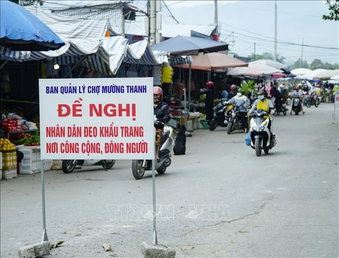 Ban quản lý chợ Mường Thanh, thành phố Điện Biên Phủ đặt biển cảnh báo đề nghị người dân chấp hành nghiêm việc đeo khẩu trang. Ảnh: Xuân Tư - TTXVN