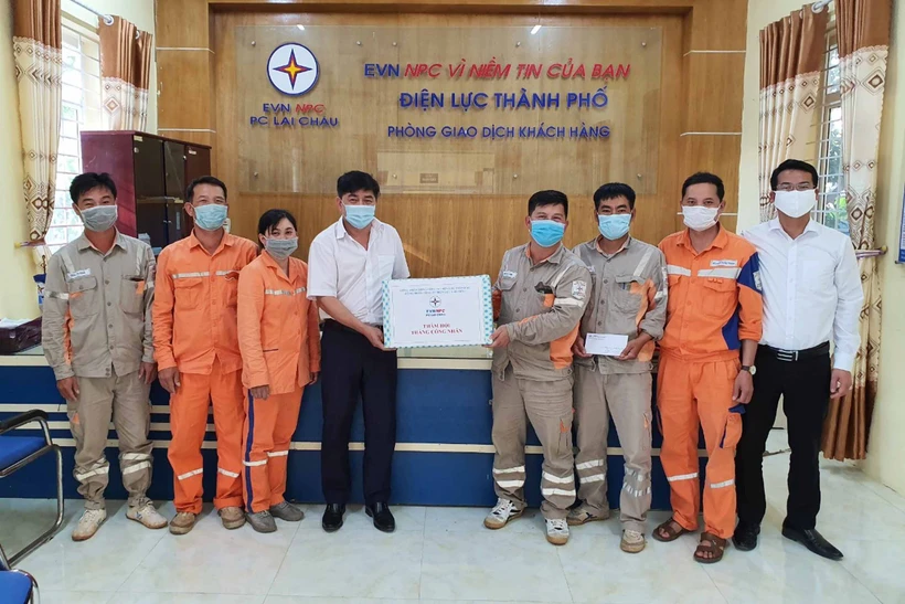 Công đoàn Công ty Điện lực Lai Châu tặng quà động viên cán bộ, công nhân tại điểm giao dịch huyện Tam Đường, thuộc Điện lực thành phố Lai Châu. Ảnh: Đinh Thùy-TTXVN