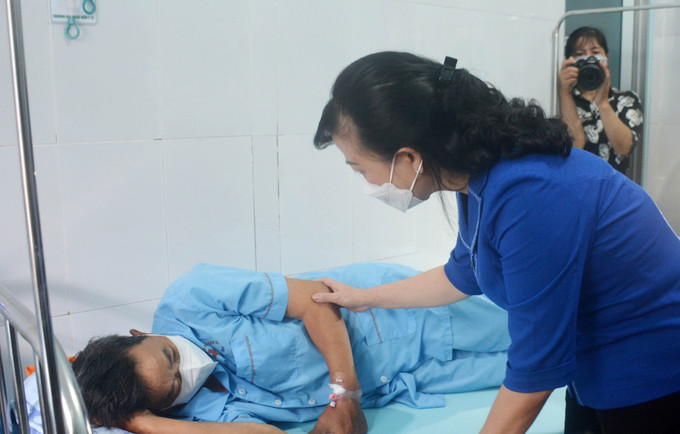 Quyền Bộ trưởng Bộ Y tế Đào Hồng Lan thăm hỏi, động viên bệnh nhân đang điều trị tại Trung tâm y tế huyện Buôn Đôn. Ảnh: Hoài Thu – TTXVN