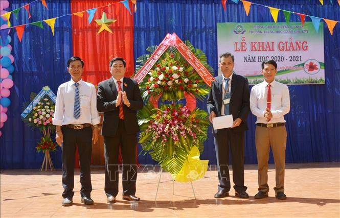 Đoàn ĐBQH tỉnh Đắk Lắk tặng hoa và quà nhân dịp khai giảng năm học mới cho Trường THCS Cư Êwi, xã Cư Êwi (huyện Cư Kuin). Ảnh: Hoài Thu – TTXVN