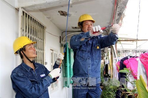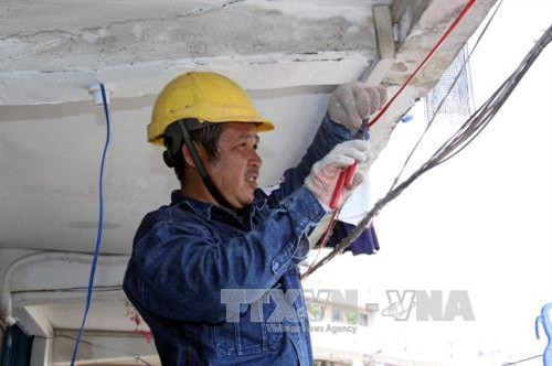 Đoàn viên thanh niên lắp đặt, sửa chữa điện miễn phí cho người dân tại chung cư Tôn Thất Thuyết (Quận 4). Ảnh: Thanh Vũ - TTXVN.