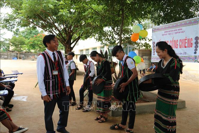 Những ngày tháng 5, khi tiếng ve kêu râm ran báo hiệu hè về, ngay trên sân trường, dưới tán cây, tiết học đánh chiêng đầu tiên được tổ chức thật đặc biệt. Những thông tin bổ ích, sự truyền dạy tận tâm… là những gì học sinh nơi đây cảm nhận được khi tham gia tiết học cồng chiêng. Trong không gian mở, được trang trí đậm chất văn hóa của dân tộc M’Nông, các em hào hứng tìm hiểu về cội nguồn văn hóa cồng chiêng, tầm quan trọng của những bộ chiêng đối với đời sống tinh thần của đồng bào Tây Nguyên và hành trình để trở thành di sản văn hóa phi vật thể được UNESCO công nhận. Hào hứng khi được trực tiếp nghe thấy âm vang tiếng chiêng, các em chạm vào từng chiếc chiêng để cảm nhận chất liệu và tự đánh lên thanh âm mang hơi thở của dân tộc.