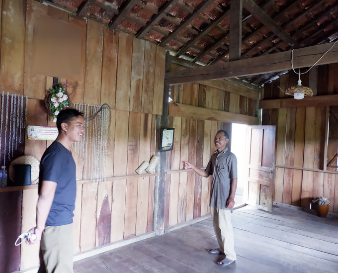 Anh A Nhưk đưa chúng tôi đến ngôi nhà sàn lâu năm nhất ở giữa làng để giới thiệu về nét độc đáo của nó. Đây là ngôi nhà của cha anh để lại cho cô em gái anh trước khi qua đời. Ngôi nhà nằm ẩn khuất giữa vườn cây um tùm, tạo một không gian yên bình và mát mẻ.