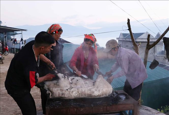Vào ngày Tết cổ truyền của người Hà Nhì, mỗi gia đình đều làm thịt một con lợn. Ảnh: Nguyễn Oanh - TTXVN