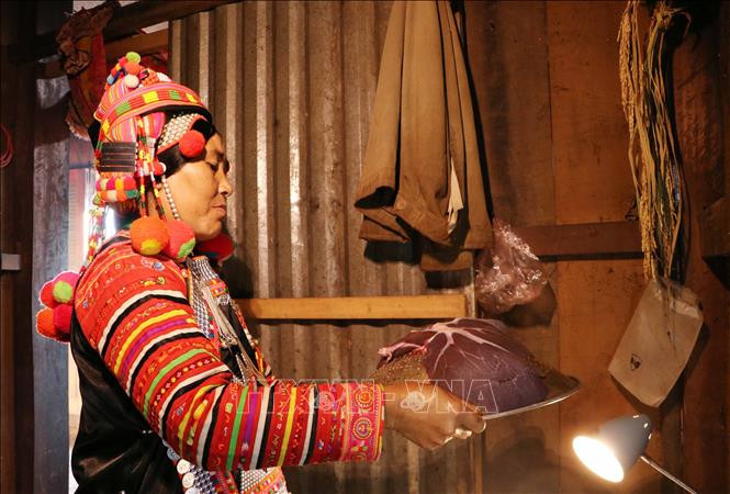 Phụ nữ Hà Nhì mặc trang phục cổ truyền nổi bật để đón Tết. Ảnh: Nguyễn Oanh - TTXVN