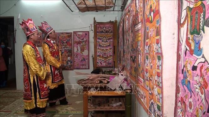 Bộ tranh thờ được trưng bày trong lễ cấp sắc tại xã Cẩm Liên, huyện Cẩm Thủy. Ảnh: Hoa Mai - TTXVN