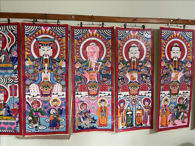 Một bộ tranh thờ trong phòng tranh của ông Triệu Hùng Cường. Ảnh: Hoa Mai - TTXVN